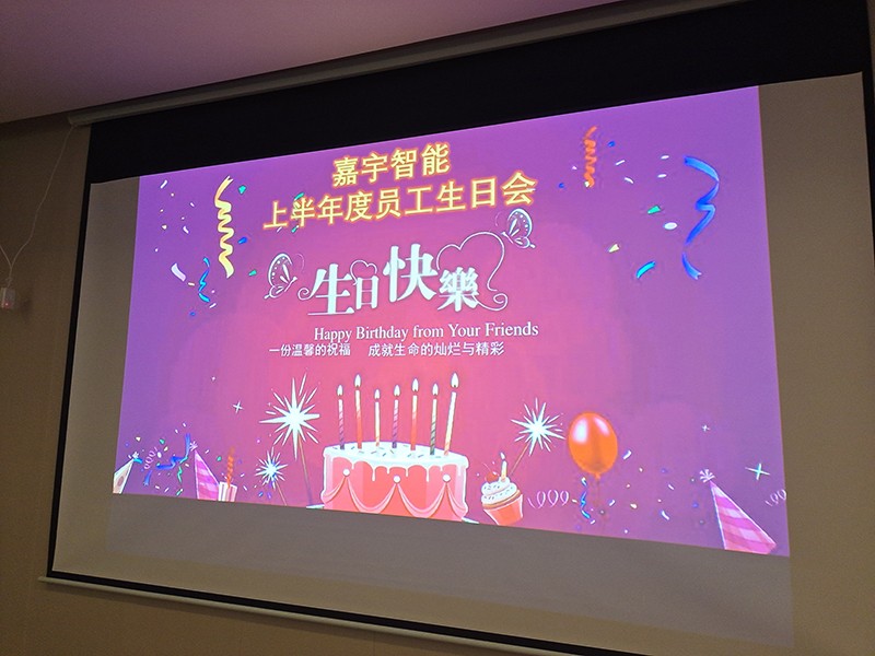 “用意想不到的甜蜜編織幸福的花籃送你,像花兒一樣綻開在你生日聚會里,于是甜蜜遍布你房間的每個角落里,愿你擁有最美好的祝福”。嘉宇智能祝各位同事生日快樂!
